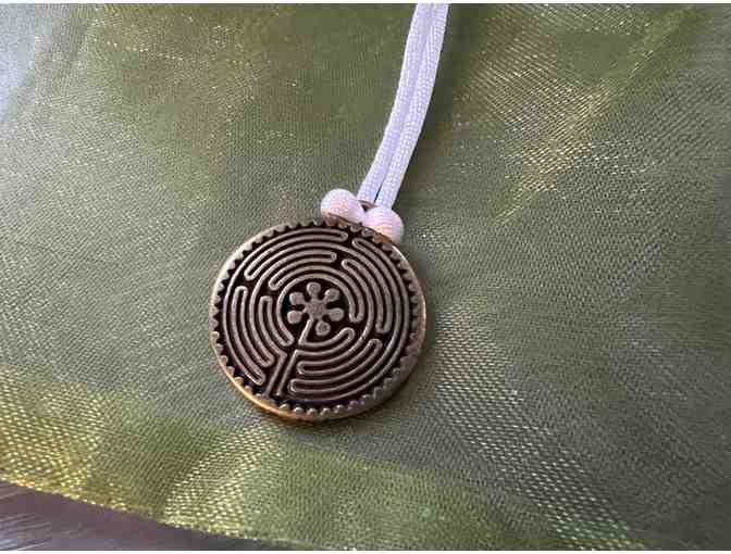 This beautiful antique-golden colored dual sided labyrinth pendant comes on a beautiful white silky adjustable pendant.  Features identical labyrinth image on the reverse.  Comfortable to wear anywhere!  Comes with a green gifting bag.