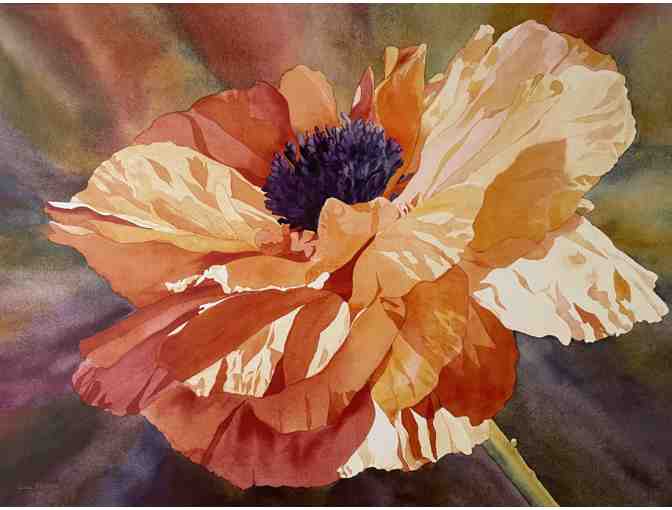 Watercolor printed on canvas and wrapped on frame. 40" X 30" Signed "Oriental Poppy" edition 26/30 by Heidi Rosner. Generously donated by Flora Wolf, who acquired it from the artist in Indian Wells, California.