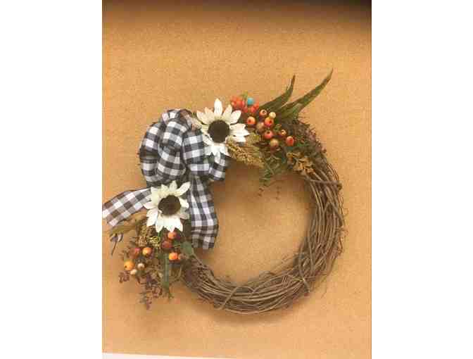 Handcrafted fall wreath with checked ribbon bow, 18 inches.