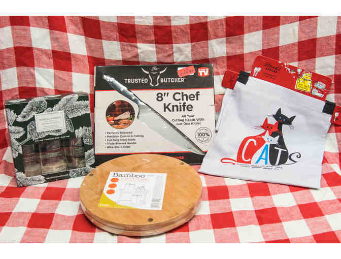 Cat apron, bamboo turntable, 8" chefs knife with Wm. Sonoma winter forest essentials set AND $25 Stop and Shop gift certificate
