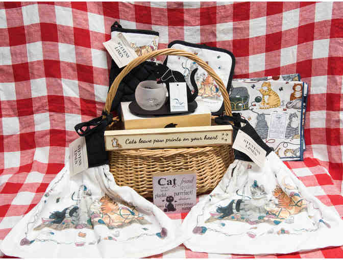 Cat print tea towels, oven mitts, placemat, "Cats leave paw print on your heart" wooden sign, kitty votive holder.