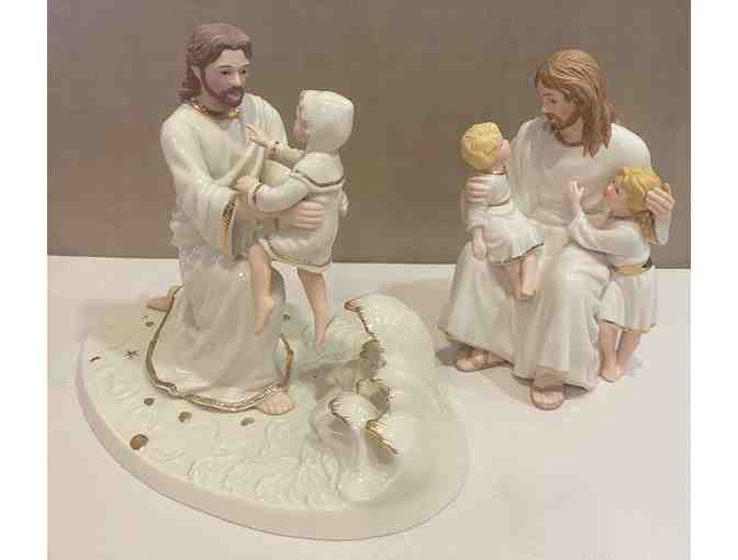 Complete your collection with these Jesus Lenox Porcelain Sculptures. It includes 'Footprints' and 'The Children's Blessing'.