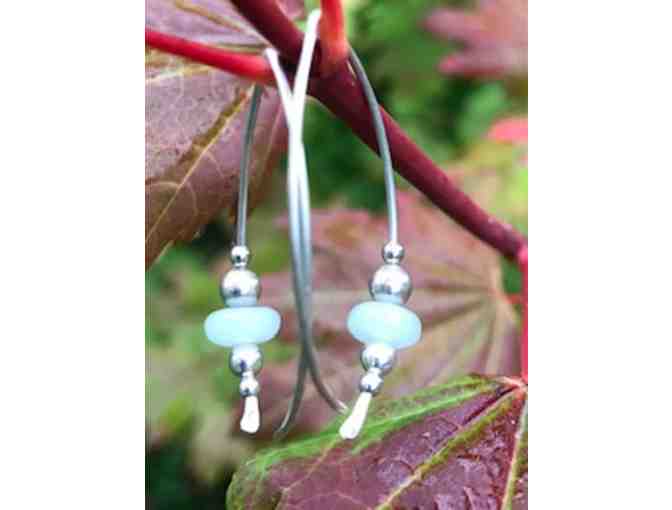 Designed and specially-made right here in Humboldt County by local artist, Betsy Roberts, for BGHP's onine auction. This pair of earrings feature sterling siver throughout. The pale blue-green tones of semiprecious Amazonite stone beads are offset by a small and larger silver bead on each side of the stone.