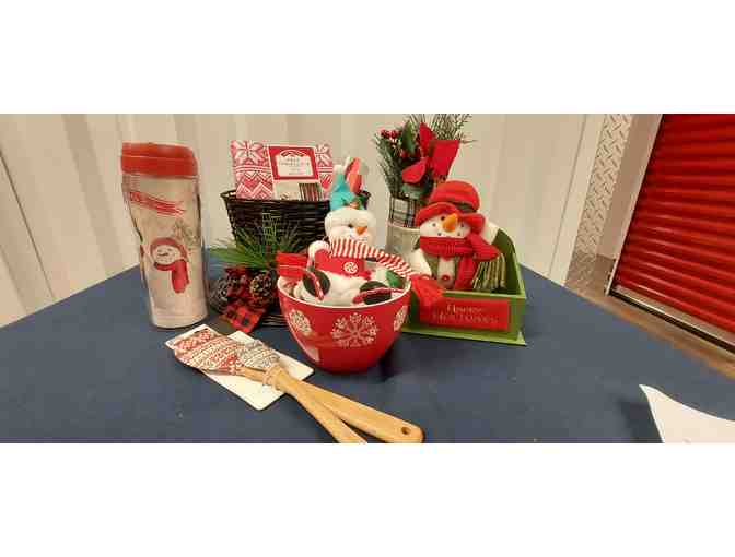 Straw top hat, 70" round table cloth, 2 large drink tumblers, snowflake patterned slate, mini utensils, 3 piece bowls and snowman letter holder