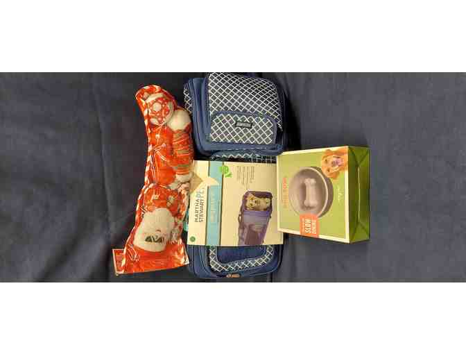 $25 Petstmart gift card, Martha Stewart pet carrier 21"x11"x10.75", stocking of dog toys and slow drinking dog bowl
