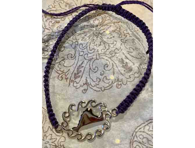 The bracelet features an outline of Martha's Vineyard surrounded by waves. The bracelet is adjustable.