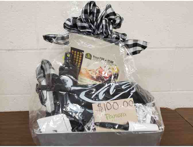 Does your family love to eat different kinds of bread? Well, here's the basket for you!! It includes a certificate from Panera Bread for "one free loaf of bread each week for a year". Now that's a lot of BREAD!! It also includes a $100 Panera Gift Certificate, water bottle, t-shirt and other items.