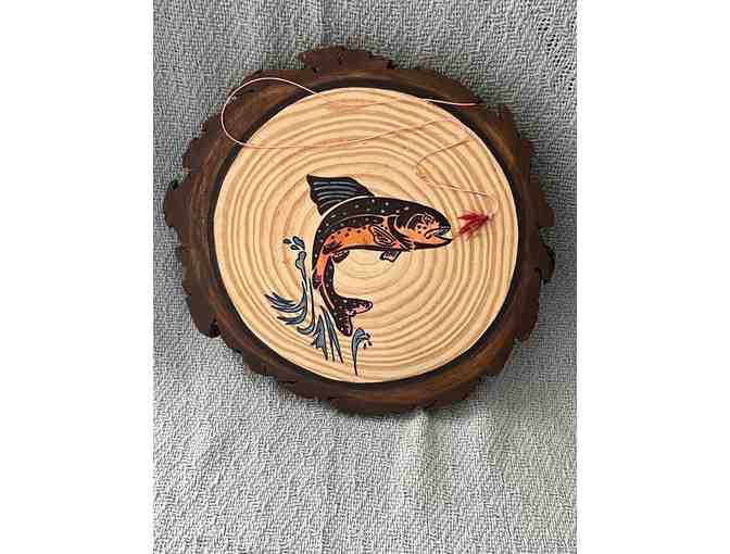 10" diameter wood disc with acrylic painted fish with fly line and fly.