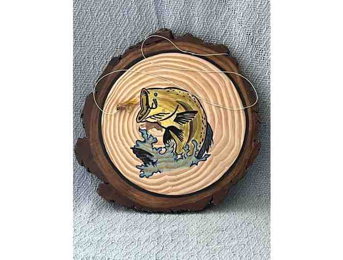 10" diameter wood disc with acrylic painted fish with fly line and fly.