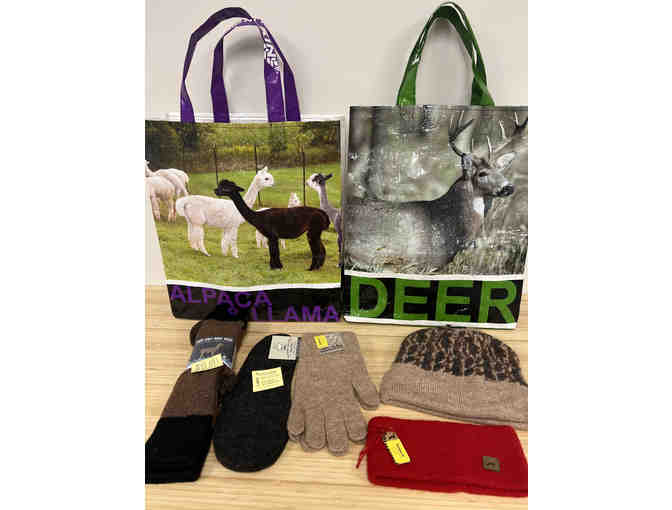 Item Description: Outdoormans package includes: 2 upcycled livestock feed bags – Deer feed and Llama/Alpaca feed, 1 alpaca hat, 1 alpaca headband, 1 pair of alpaca gloves, 1 pair of alpaca boot socks, 1 pair alpaca boot felts.