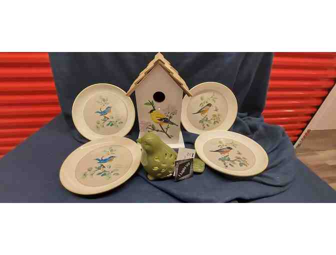 4 bird design dessert plates, bird house with pole and ceramic bird lights. Batteries included.