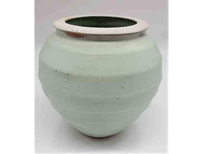 This light green, wheel-thrown porcelain vase is a lovely piece by Peggy Loudon. Special details such as the textured/patterned top edge and soft ridges around the body, create a one-of-a-kind piece. The approximate dimensions are 6.75" tall, 5.25" across the top, 7" at widest part, and 3" across the bottom.
