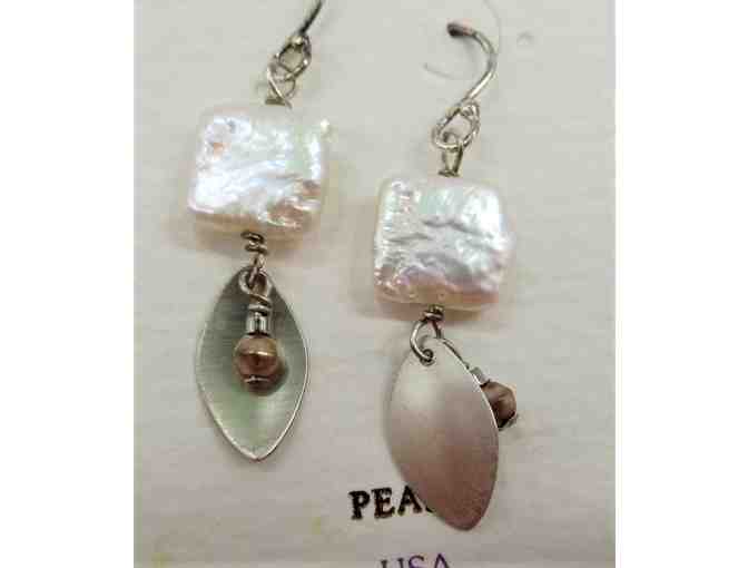 These earrings have lustrous square pearls with dangling tiny brown pearls hanging in front of silver metal pieces. A very delicate look. The pearls are about 3/8" square, and the total length including ear wires is about 1.5".