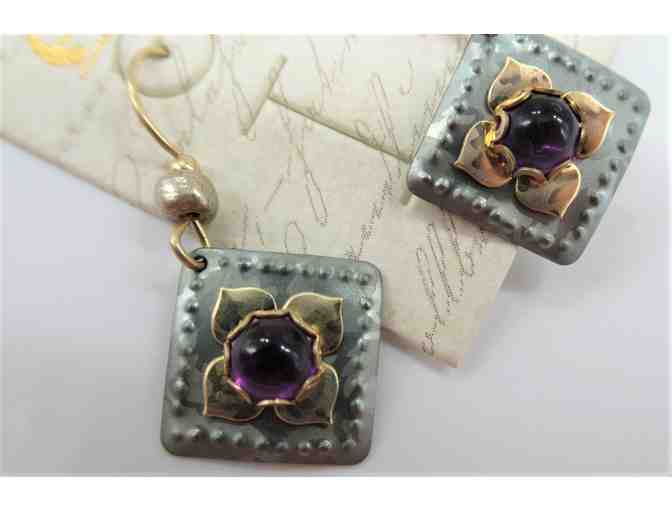 These vintage earrings feature Holly Yashi style in soft muted colors. A gold flower with an amethyst colored stone in the center is set on a gray-green square of Niobium with an embossed edging. This vintage pair of earrings is signed on the back. The photos don't capture the lovely colors.