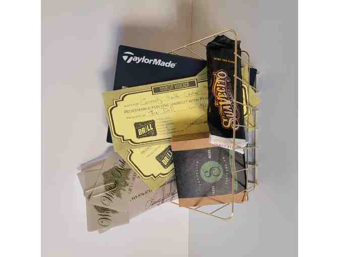 Get pampered then hit the course! 2 Haircuts with Phill the Drill, hair products, 2 green fees with cart at the Fort Dodge Country Club and a box of Taylormade golfballs.