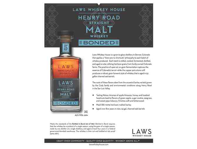 Laws Whiskey Two (2) full sized bottles - 750 ml/each - Four Grain Straight Bourbon Whiskey and San Luis Valley Straight Rye Whiskey, both bottled in bond.To be labeled bottled in bond, a whiskey must be the product of a single distiller in a single season—spring (January to June) or fall (July to December)—aged for a minimum of 4 years in a federally bonded warehouse, and bottled at 50% ABV.
