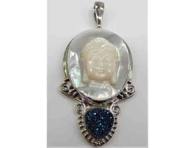 Vintage Sajen pendant, handcrafted of sterling silver (hallmark 925 and Sajen stamped on the back) with a beautiful carved Buddha face that appears to be mother of pearl and accented with a glittering dark blue druzy quartz stone. A very stunning piece!