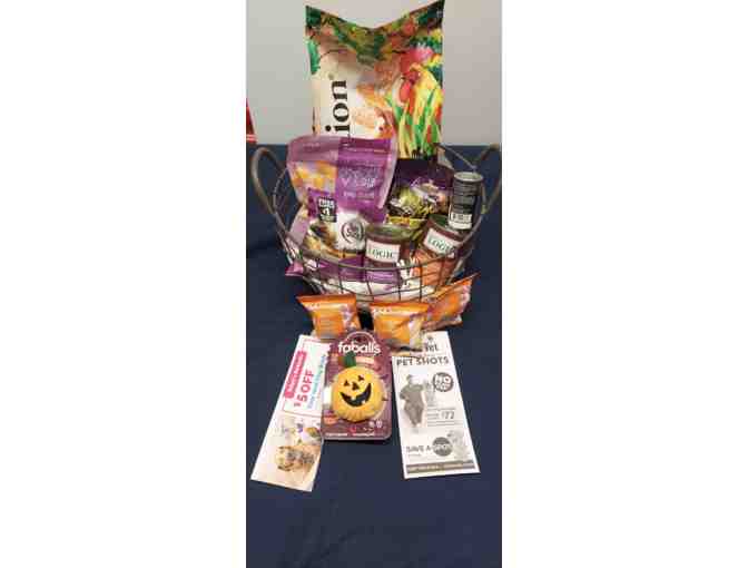An assortment of natural food treats for your favorite pooch, 2 cans of logic dog food, bag of companion dry food, pumpkin faballs squeak toy