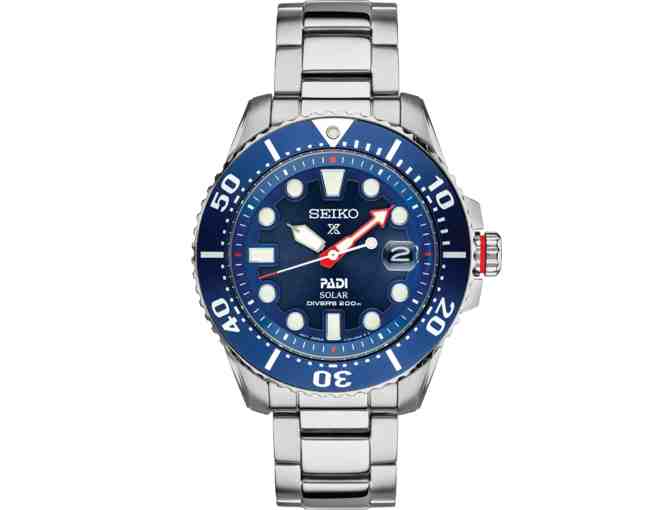 Seiko Men’s Diver Watch. Powered by light-energy with a 10-month power reserve once fully charged. Date calendar with magnified glass. Screwdown crown and casebook; one-way rotating elapsed bezel; LumiBrite hands and markers; and stainless steel case and bracelet. Water resistant up to 200 meters. Measures 43.5mm diameter.