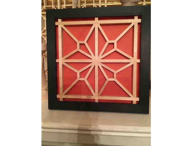 A Kumiko is a traditional Japanese technique, made of many wooden bars crossed and laid to form various designs and expressions. No nails or metal pieces are used, and the wooden parts are put together by adjusting grooves and angles. It is then framed (handmade) with an orange background.