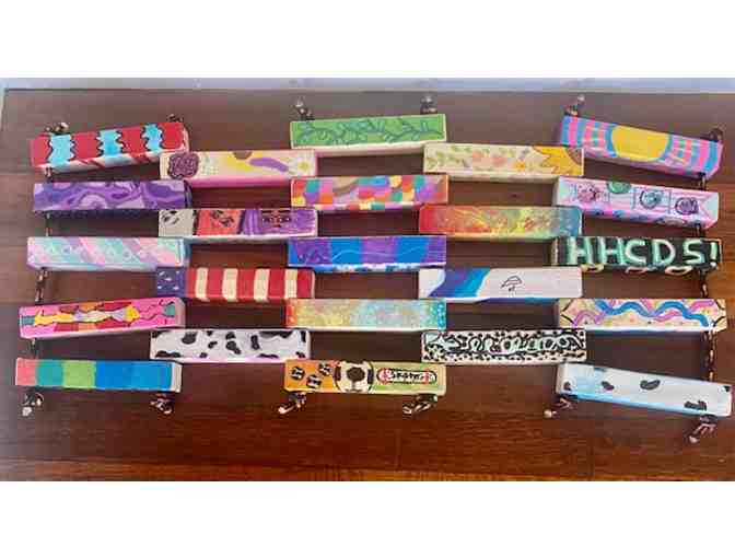 Created by all of the Grade 5 students. Individual wooden pieces are personally designed by each student and are woven together to create a beautiful and decorative floor mat.