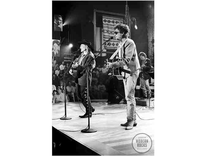 Framed, limited edition, signed and numbered Scott Newton print of Willie Nelson and Bob Dylan, taken at The Big 60 in Austin in 1993, 13”x18”