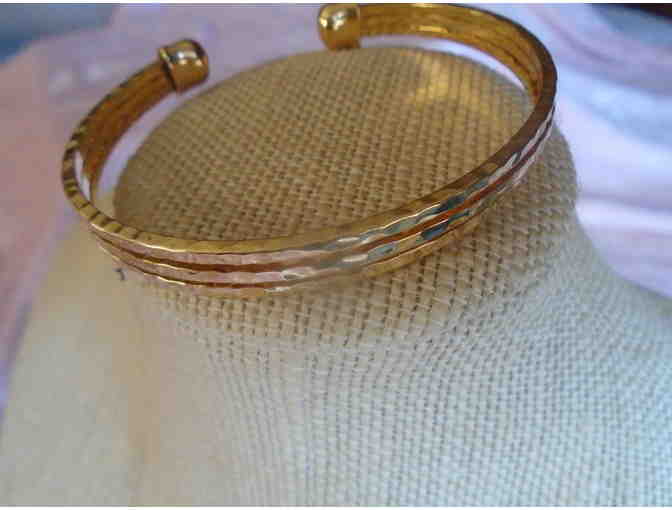 This cute bracelet is done in textured gold tinted metal. It is a nice gift for someone or a great addition to your jewelry box....