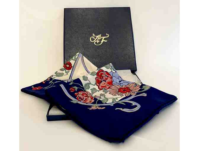 This large square was made in the silk workshops of Lyon and was chosen especially for the Fédération des Alliances Françaises for their annual conference. The pattern recalls 18th century floral design.