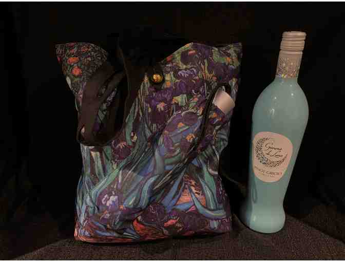 Wild Irises watercolor themed matching shopping bag and umbrella. Paired with a bottle of Pinot Grigio.