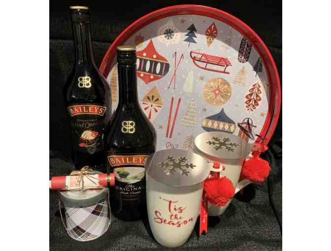 Christmas tray with a pair of mugs, a candle, and matches accompanied by 2 bottles of Bailey's Irish Creame Liquore: 1 Orginal and 1 Salted Caramel. Alcohol donated by the Methuen Festival of Trees.