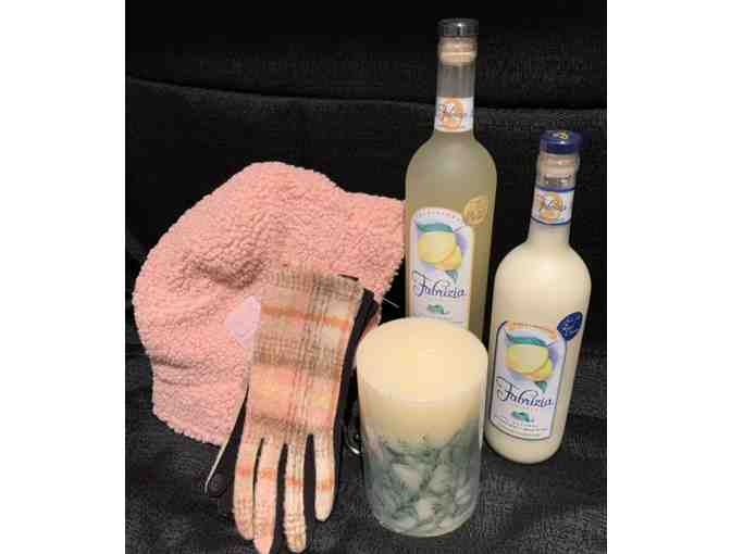 Basket includes matching pink hat and gloves, a pine candle, and a dou of limoncello. Alcohol donated by the Methuen Festival of Trees.