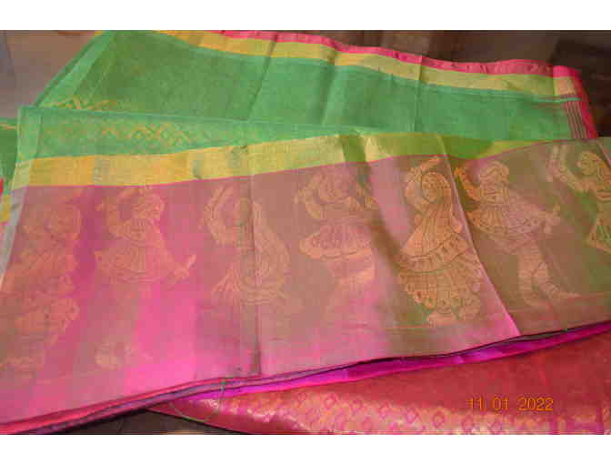 Parrot Green with Shocking Pink Organza Saree. Grand Saree with Gold brocade in the body and ethnic motif in the border. Has a free size stitched gold blouse and a pink blouse piece.