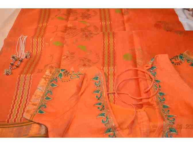 Fanta Orange Kota saree with made to order embroidered Blouse. Includes jewelry.
