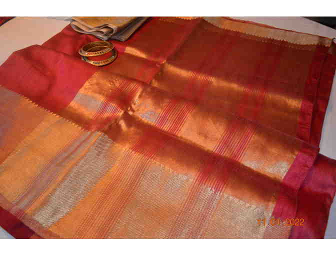 Silk cotton Red saree with gold border. Comes with unstitched gold blouse and bangles.
