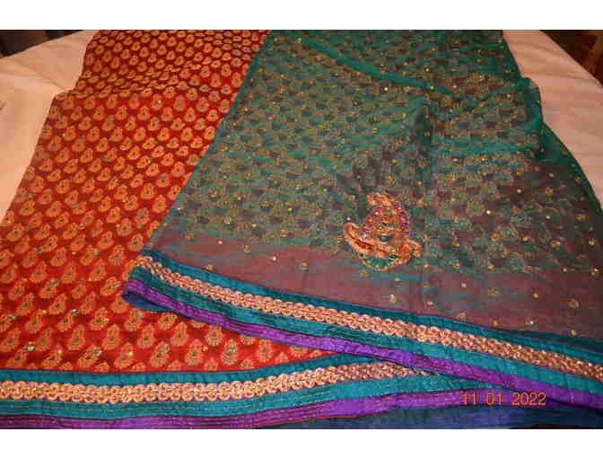Dazzling red sari with gold zari motifs and paisley applique in between with Jade green net pallu. Great for any special occasion or during holiday season