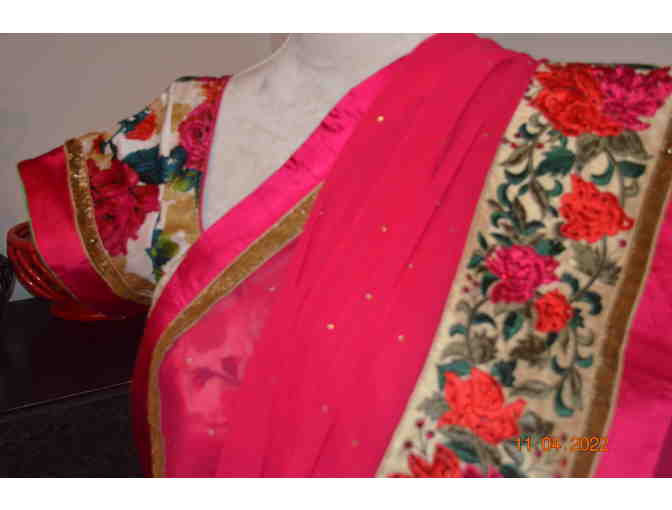 Holiday party wear is this shocking pink sari with attached roses on vines border and a matching designer blouse