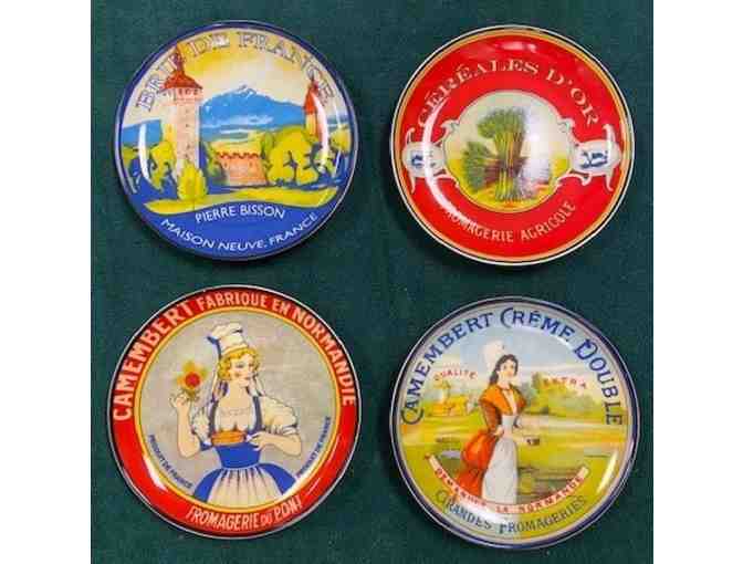 Bring a vintage feel to your next party with these cheese-themed appetizer plates. The set of four is perfect for wine and cheese gatherings. 2004 vintage, they come in the original round ribbon-tied storage box.