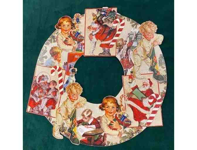 This vintage wooden wreath depicts the joy of Christmas morning when children discover what Santa left for them on his annual visit. Lightweight and set for hanging in a prominent location, it is sure to bring smiles of anticipation. Raised elements bring a 3D appearance. Wreath measures approximately 19" across x 1/4" thick.