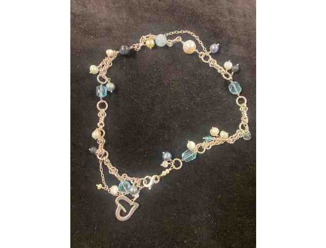 Sterling silver chain is 16" long and adorned with onyx, freshwater pearls and aquamarine. A fine silver heart charm adds a special touch.