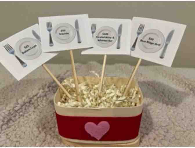 $50 Travinia, $100 Parallel Wine and Whiskey Bar, $50 Blue Ridge Grill, and $25 Bakers Crust