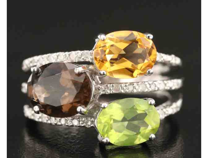 Stunning Sterling Silver ring with genuine peridot, smokey quartz, citrine, and diamond gemstones. Size 7