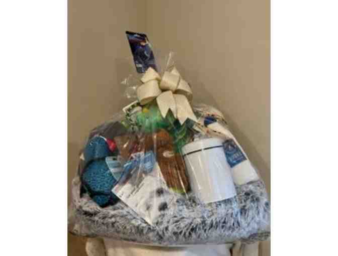 Pet blanket, feeding placemat, sweets and treats tin, waste bags & holder, pet grooming glove, Capital's hockey rope and toy, collapsable water bowl, dog toys, $50 Petco gift card, dog day party goods, dog bed, feeder slow bowl