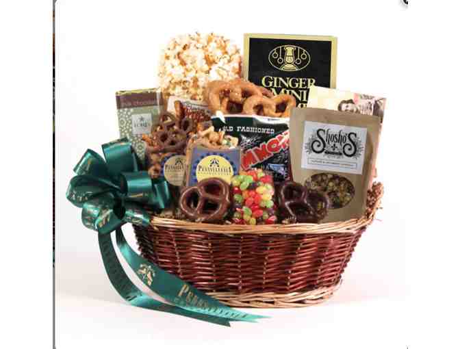 Celebrate any occasion with this collection of great locally made snacks. It includes Hammond's Pretzels, Rosie's Butterkins Cookies, Shosho's Kitchen Granola, Lore's Chocolate Covered Pretzels, Sweetzel's Ginger Snapss, Great American Cheddar Cheese Popcorn, Just Born Jelly Beans, Nine Variety Pretzel Mix, Society Hill Party Mix, Lore's Milk Chocolate Candy Bar and Pennsylvania General Store's Sweet Indulgence.