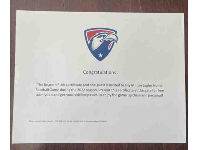 Your football fan will be in for a treat this Fall! Allow him/her to experience a Milton High School football game of your choosing with sideline passes to enjoy the game up close and personal! This pass is good for the winner and a guest.