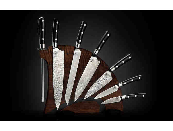 The Kultro Pro Series is robust and rugged, built to commercial grade specs but worthy of the finest kitchens. The set includes six knives ranging from paring to 9.5” chefs, each finely crafted from forged stainless damascus steel. This gorgeous material features 103 layers, 51 layers of stainless steel on each side of a core of 10Cr15V, an edge steel that is vacuum heat treated and tempered to an optimal hardness of HRC 60 for sharpness, wear resistance, and superior performance. The damascus blades are seamlessly welded into stainless bolsters and a full tang, with compressed carbon fiber handles secured by stainless pins. Visually stunning, razor sharp, beautifully weighted and balanced, these are tools elevated to art. A matching diamond coated sharpener completes the set, which is shipped in its own professional grade leather roll with protective blade covers.