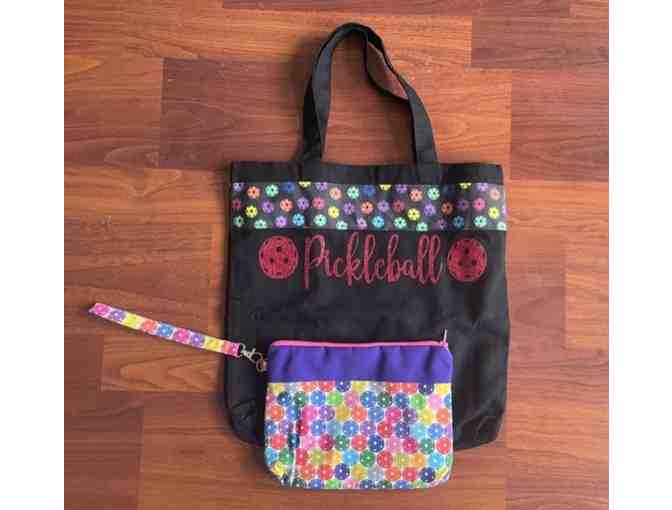 These pickleball totes are practical, eye-catching, fun, a bit sparkly, and unique! Made from 100% cotton canvas, the totes are 13.5" H x 13.5" W x 2", which leaves plenty of room inside for your pickleball paddles. The tote is embellished on the outside with additional custom fabric and a sparkly pickleball logo designed by me. Please note; although the logos are glittery material, they do not shed! Inside they boast a 9" H x 7 .75" W" pocket made from custom pickleball fabric by Spoonflower. The pocket is perfect to tuck pickleball gloves, a wallet, or eyeglasses. In addition, there is a 9" H x 5" W mesh pocket with an elastic opening for stashing pickleballs or a water bottle (not included). Spot washing is recommended. The pickleball wristlet is practical, eye-catching, fun, and unique! Approximately 6" H x 9" W x1" with a removable 7" strap. Made from 100% cotton, custom pickleball fabrics designed by Spoonflower, trimmed with purple canvas. The inside fabric is waterproof, so these wristlet purses can easily double as a cosmetics bag. Roomy enough for all your essentials, on and off the court! A perfect gift for your pickleball enthusiasts!
