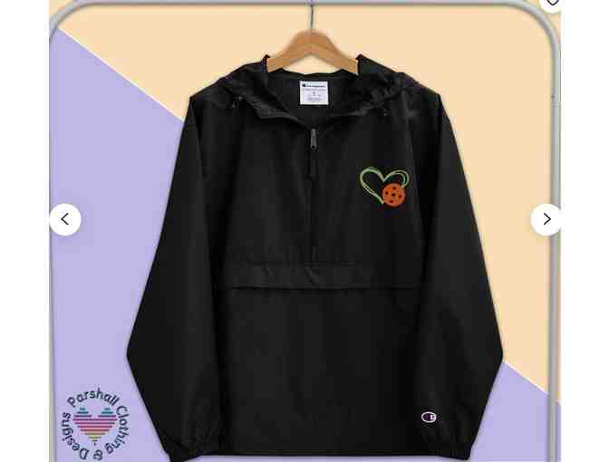 Black Champion Wind and Rain Proof Packable Lightweight Jacket. (Adult L). Embroidered Pickleball heart with Red/Orange Ball. Perfect for the avid Pickler -- packable, portable, and pickle-y. Made from wind and rain-resistant polyester micro poplin, it's perfect for outdoor sports and travel. It features a convenient storage option, the zipped hidden pouch pocket pulls out, and the whole jacket can be packed into it.