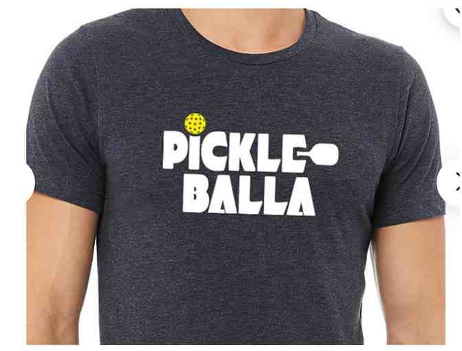 Let everyone know you're a PICKLEBALLA! Awesome Pickleball t-shirt featuring original PICKLEBALLA heat-transferable vinyl (HTV) designs on the front and back of a unisex, heather navy, 52/48 cotton/poly blend (SUPER SOFT) Bella+Canvas t-shirt. The front features the original PICKLEBALLA logo. Great to wear ON or OFF the court.