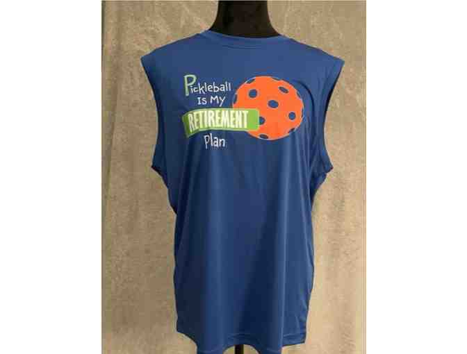 Pickleball is my Retirement Plan - Men's Styles: Sleeveless (M). Shirts are lightweight, roomy and highly breathable. These moisture-wicking shirts are designed for athletic performance. They feature PosiCharge technology to lock in color and prevent logos from fading. 3.8-ounce, 100% polyester interlock with PosiCharge technology.