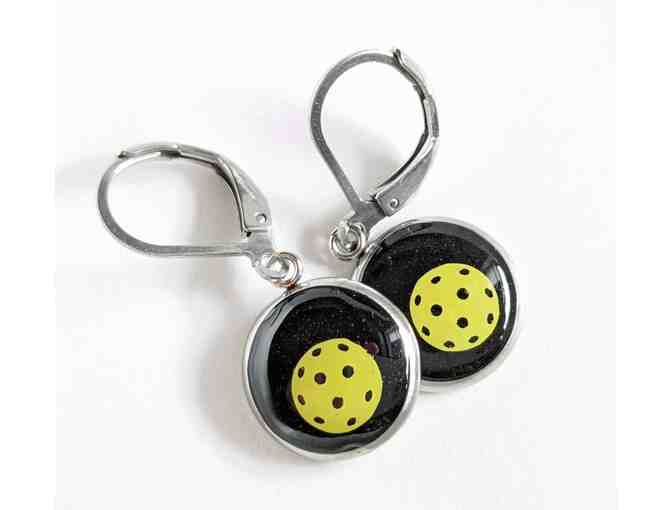 Every season is Pickleball season! All stainless steel earrings with a hand poured black resin (with a slight shimmer) backdrop to show off the yellow pickleball. Earring hangs 1 1/8" (1/2" round) and has a lever back so you can wear with confidence that you won't loose these on the court! These earrings are so lightweight that you will forget you are wearing them! NOTE: the resin charm may very slightly in pattern due to the hand pour process and the hand cut pickleball.